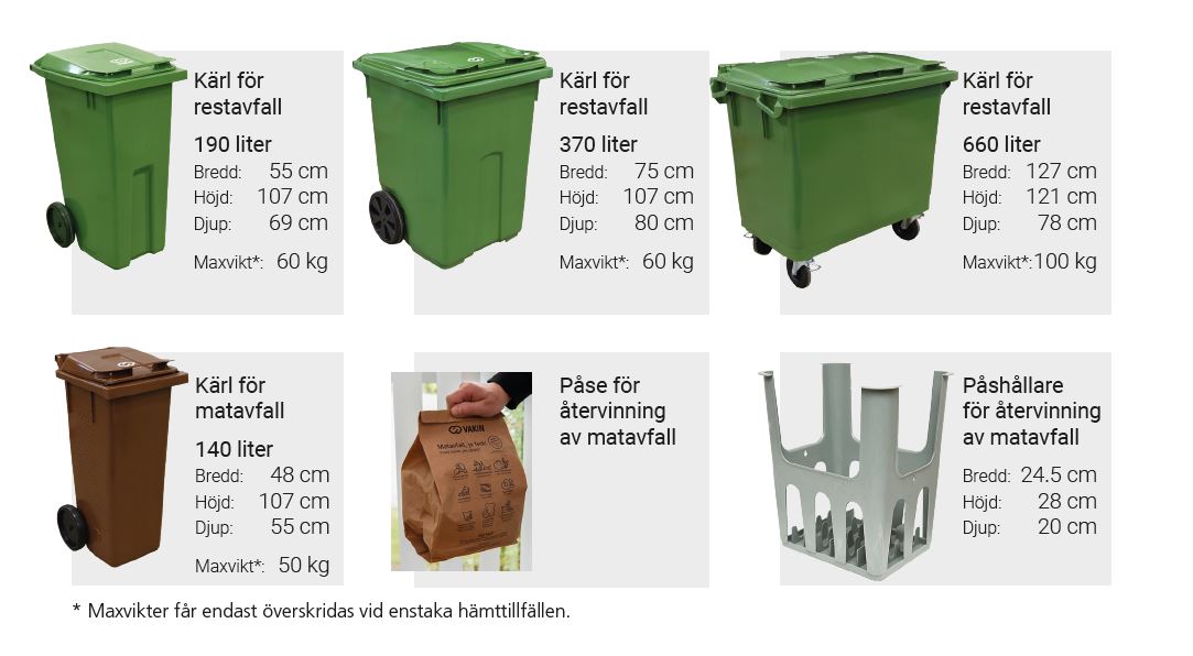 Prislista finns nedan. Vi hämtar avfallet vardagar men det finns möjlighet att få det hämtat på helgen mot en högre avgift.
