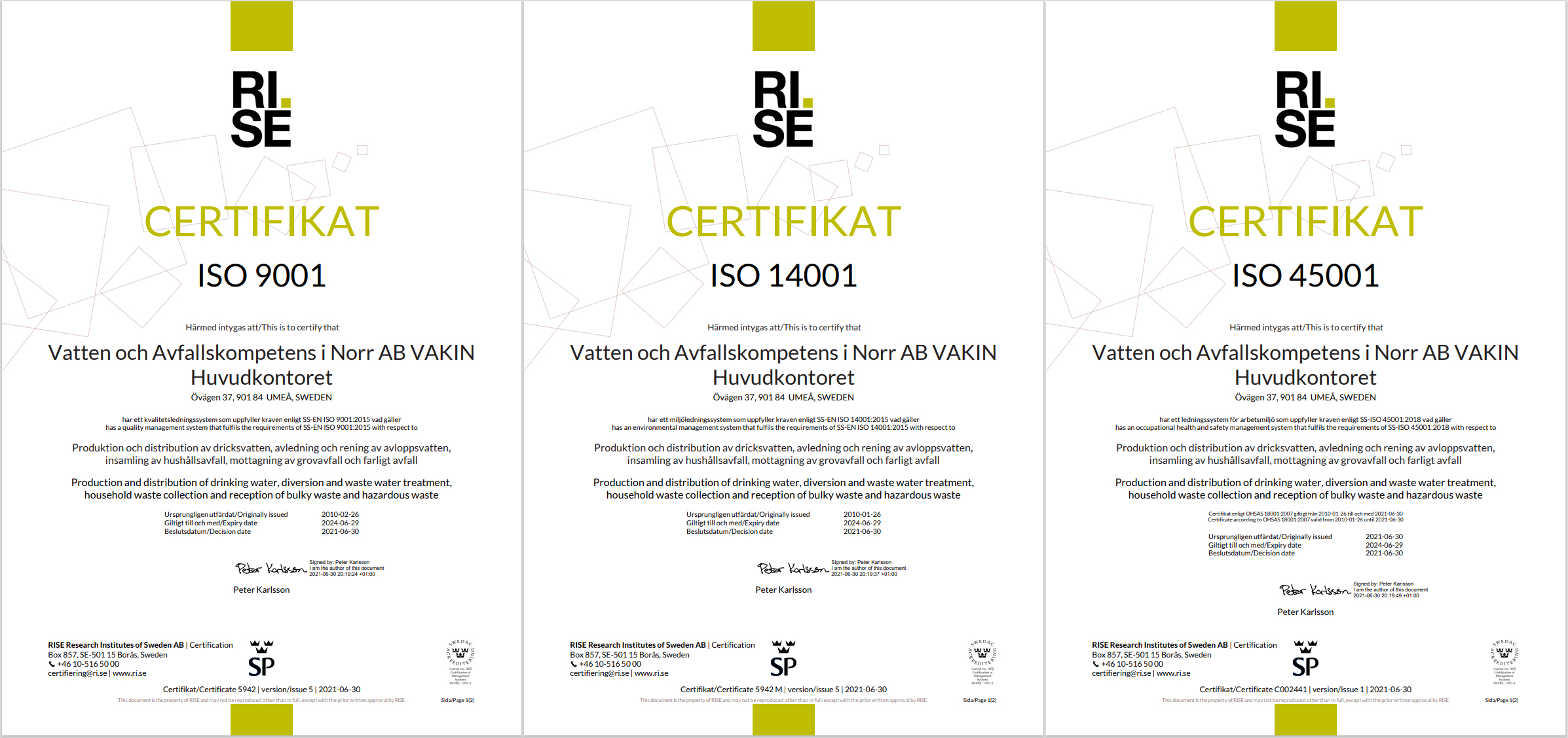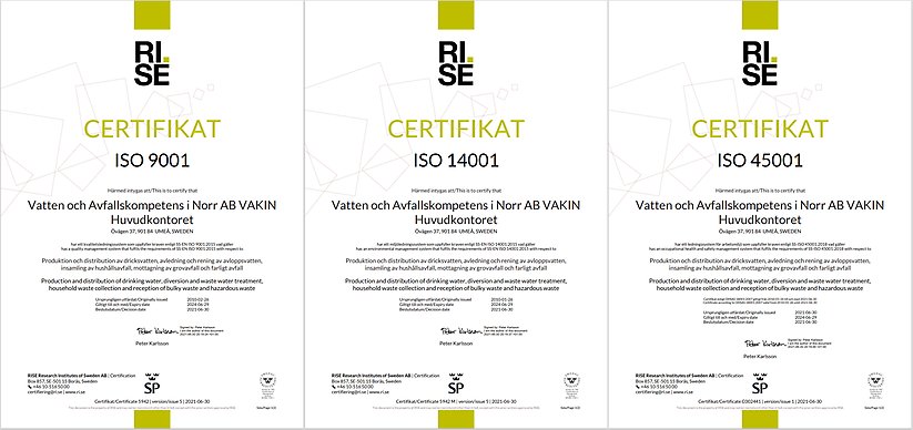 Vakin är miljöcertifierade enligt ISO 14001, arbetsmiljöcertifierade enligt ISO 45001 och kvalitetscertifierade enligt ISO 9001*.